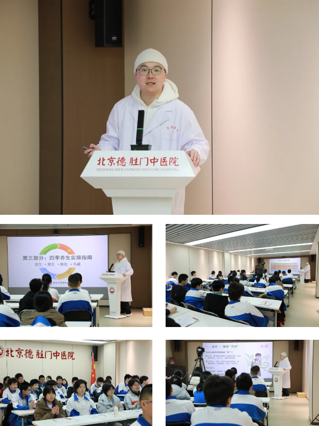 北京德胜门中医院特聘专家、名老中医刘伟传承工作室弟子郭冬琪博士为同学们带来了题为《跟着四季防六邪——中学生实用养生指南》的讲座。郭博士结合中医理论,深入浅出地讲解四季变化对人体健康的影响,以及如何通过饮食、作息和运动来防范“风、寒、暑、湿、燥、火”六邪。同学们由此对中医药文化有了更系统、更深入的理解。
