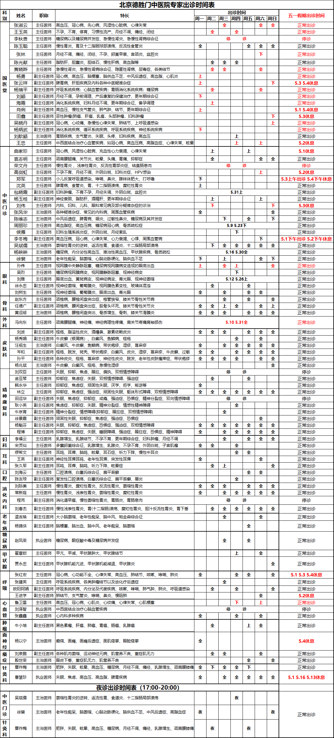 北京德胜门中医院五一假期专家出诊时间表