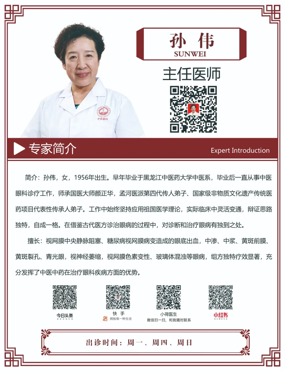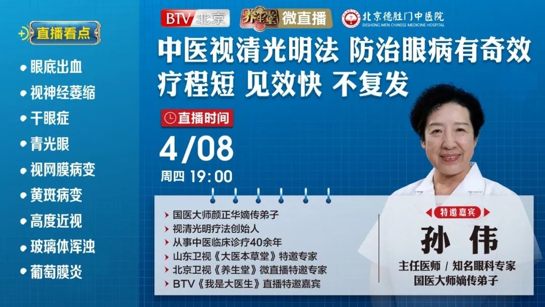 如果查出有眼底出血、视神经萎缩、青光眼、白内障、高度近视、黄斑前膜、黄斑水肿、黄斑裂孔、玻璃体浑浊等眼病,很多人都迫切想要得到一个好的救治办法。今天,我们直播间特别请来了一位著名眼科专家,她有四十多年的临床经验,而且她是“视清光明疗法”创始人,国医大师颜正华嫡传弟子,北京德胜门中医院眼科主任医师,孙伟主任,她通过中医特色疗法,可以不手术、不激光、不打针,帮助大家一招解决眼病难题,真正做到疗程短、见效快、不复发!4月8日晚上7点,孙主任为大家讲解眼科知识,同时在直播现场抽取问题进行解答,您有任何眼病都可以来直播间提问!